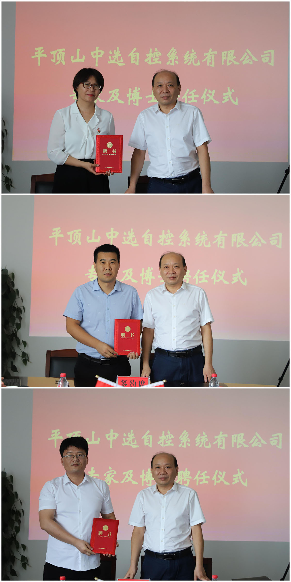 中選自控系統(tǒng)有限公司總經(jīng)理王巍與受聘專家簽署聘任協(xié)議,為董燕飛院長(zhǎng)、梁成武博士、司文杰博士頒發(fā)聘任證書。
