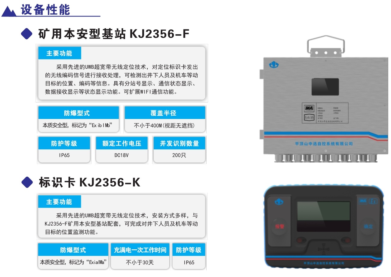 產(chǎn)品簡介:KJ2356J煤礦井下人員精確定位系統(tǒng),采用超寬帶無線(UWB)、慣性測量單元(IMU)、到達時差法(TODA)等多源融合定位方法,實現(xiàn)井下移動目標(biāo)定位精度小于0.3米的井下類GPS系統(tǒng)。該系統(tǒng)不僅強化了人員位置的精準(zhǔn)感知,實現(xiàn)煤礦井下作業(yè)人員位置的監(jiān)測管理、報警、各類數(shù)據(jù)查詢及報表功能。同時支持與車輛定位融合,將精準(zhǔn)定位技術(shù)應(yīng)用到井下機車、采掘裝備等各類設(shè)備。該系統(tǒng)具有定位精度高、抗干擾能力強,系統(tǒng)容量大、安裝使用簡便等特點,對煤礦高效生產(chǎn)和應(yīng)急教援具有十分重要的意義。該系統(tǒng)不僅強化了人員位置的精準(zhǔn)感知,實現(xiàn)煤礦并下作業(yè)人員位置的監(jiān)測管理、報警、各類數(shù)據(jù)查詢及報表功能。同時支持與車輛定位融合,將精準(zhǔn)定位技術(shù)應(yīng)用到井下機車、采掘裝備等各類設(shè)備。