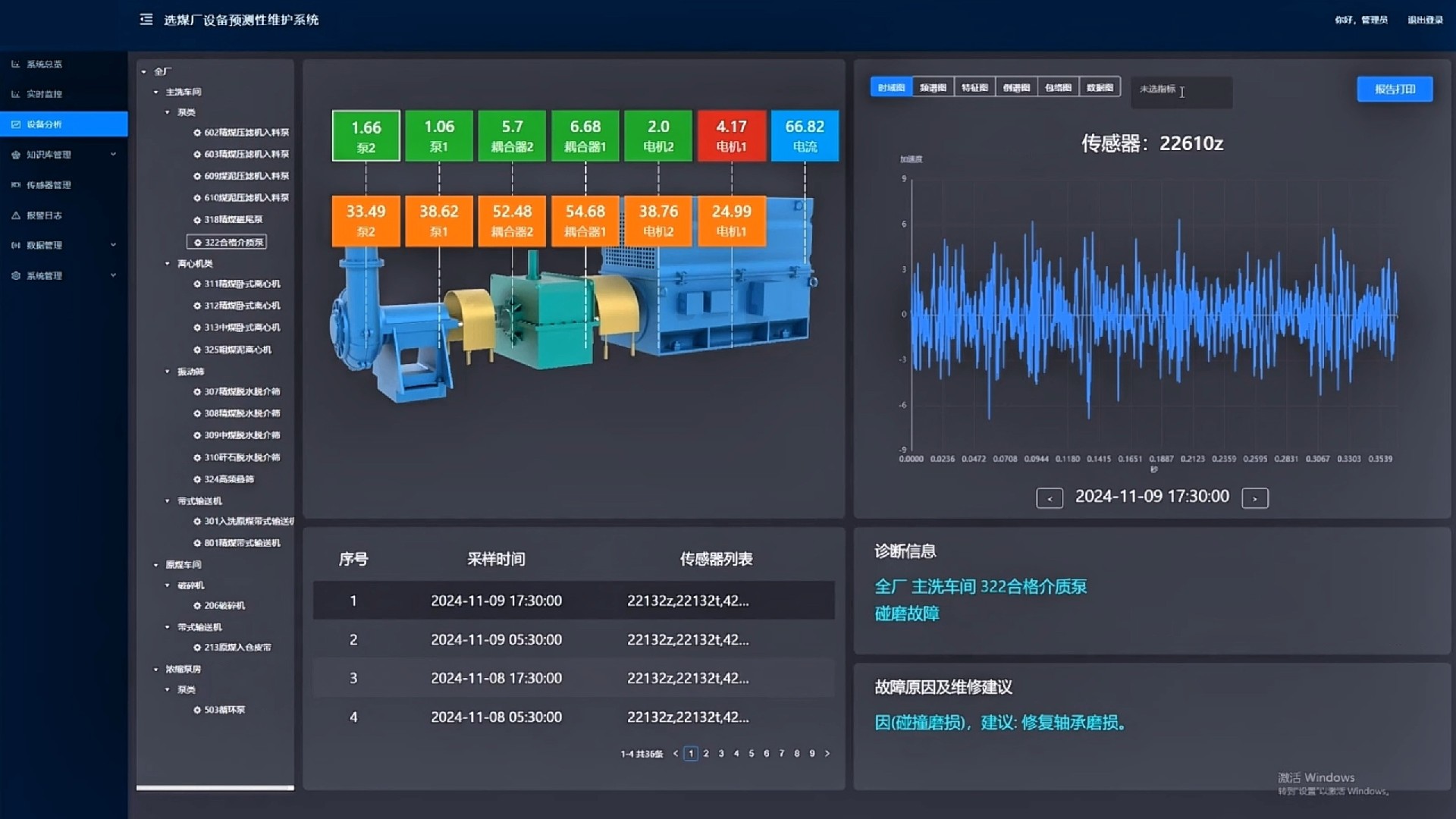 產(chǎn)品簡介:選煤廠設備預測性維護系統(tǒng)實時采集選煤廠生產(chǎn)設備的多維數(shù)據(jù)(溫振數(shù)據(jù)、電氣數(shù)據(jù)、設備實時數(shù)據(jù)、設備管理數(shù)據(jù)、音視頻數(shù)據(jù)),利用先進數(shù)字信號處理算法、人工智能算法、專家知識庫等方法對設備進行實時監(jiān)測、故障分析和故障溯源。在設備出現(xiàn)異常時,能夠分析出異常原因,給出合理維修建議,生成維修報告并白動推送給檢修人員,指導檢修人員進行設備維護,實現(xiàn)流程化閉環(huán)管理。選煤廠設備預測性維護系統(tǒng)可早期發(fā)現(xiàn)設備異常,實現(xiàn)由“事后維修”向“預知檢修”的轉變,從而實現(xiàn)設備維護安全損失最小、總維護成本最低、總維修時間最少。